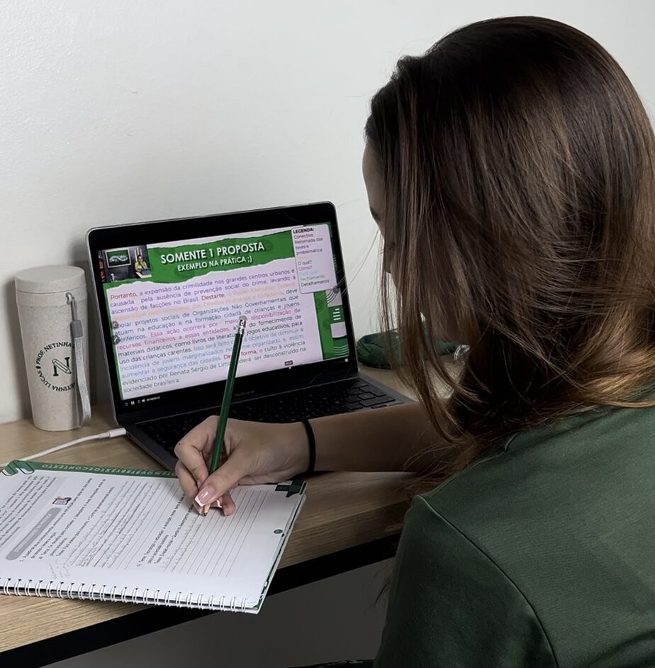 Temos as monitorias, momentos em que os alunos recebem acompanhamento individualizado durante o processo de aprendizado, na qual são auxiliados no desenvolvimento das redações semanais.