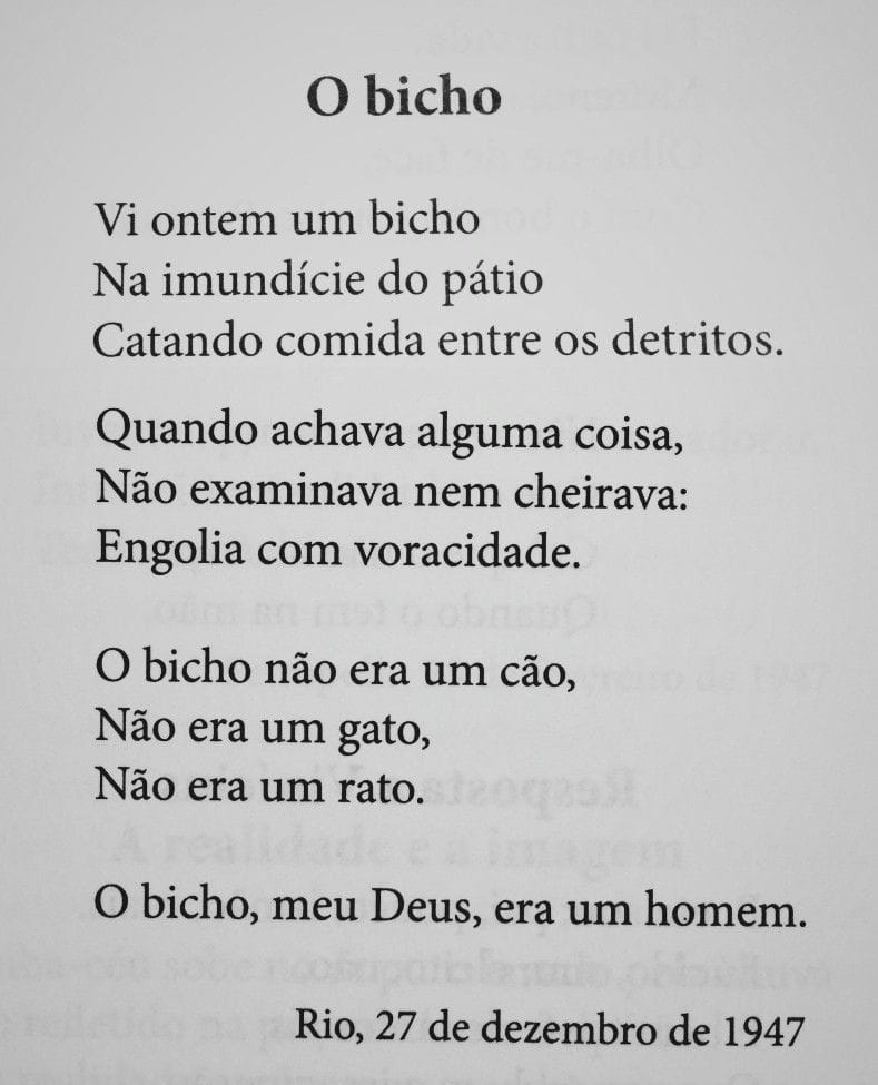 Escrito no Rio de Janeiro, no dia 27 de dezembro de 1947, o poema retrata a realidade social do Brasil imerso na miséria durante a década de quarenta. Aparentemente simples, mas afinal desconcertante, o poema denuncia uma ordem social fraturada. Bandeira descreve a cena de um homem revirando o lixo em busca de alimento, sendo confundido com um animal, o que denuncia a situação de extrema pobreza e a desumanização resultante da desigualdade social.